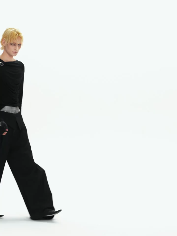 This form-fitting top is crafted from a high-stretch, fluid fabric that gathers across the chest to create intricate, organic folds. The fluidity is interrupted by a tough, industrial leather strap with a silver metal buckle at the shoulder, adding a touch of bondage-inspired edge. It’s the perfect layering piece for a sophisticated, dark-avant-garde look.