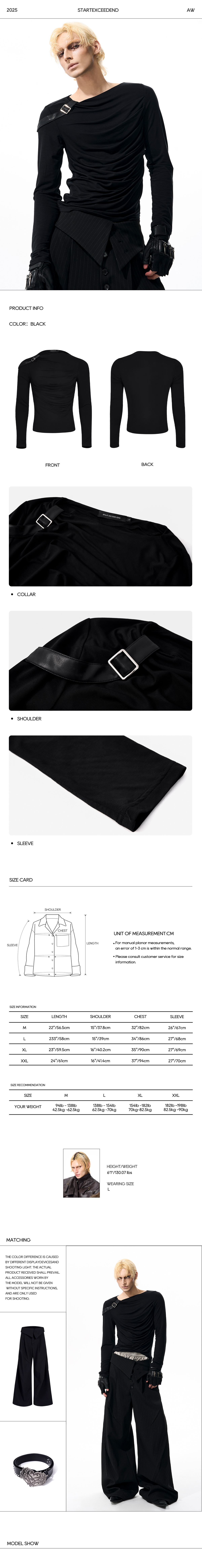 Elevate your essentials with the ASYMMETRIC RUCHED BUCKLE STRAP LONG SLEEVE TOP. A study in drape and tension from START EXCEED END.