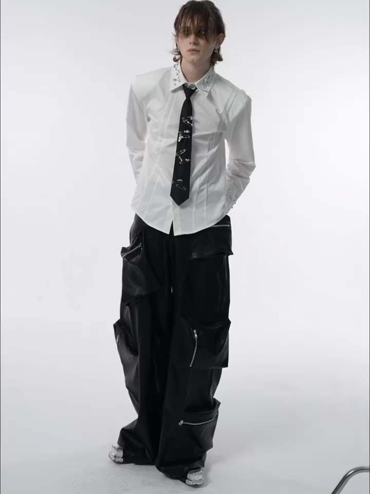 This crisp white shirt is defined by its dazzling details. Hand-set glass crystals and rhinestones adorn the sharp point collar and French cuffs, catching the light from every angle. The front features a concealed placket for a seamless, minimalist look, enhanced by structured vertical piping that elongates the torso. It’s the ultimate statement piece for weddings, galas, or high-end club nights.