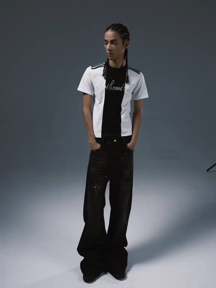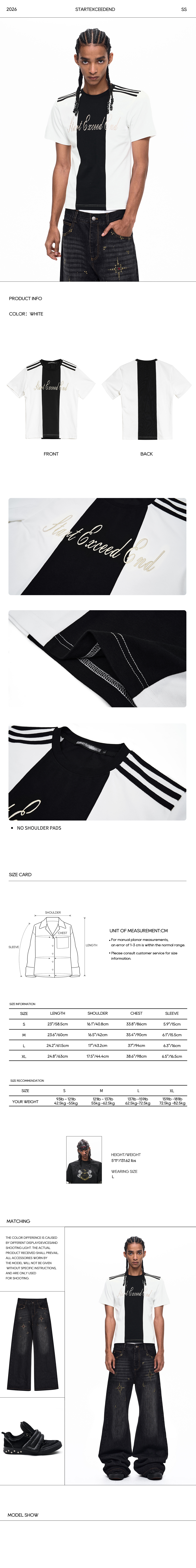 Upgrade your everyday rotation with this vintage-athletic inspired short-sleeve tee. Defined by a striking color-block design, it features a bold black vertical center panel against a crisp white body, perfectly complemented by classic 3-stripe detailing on the shoulders. The chest is elevated with elegant gold/beige cursive embroidery reading "Start Exceed End," breaking up the athletic lines with a touch of subculture refinement. Cut in a flattering standard-shoulder, tailored fit, it perfectly balances sporty nostalgia with a modern alternative edge, making it an effortless match for baggy denim or cargo pants.