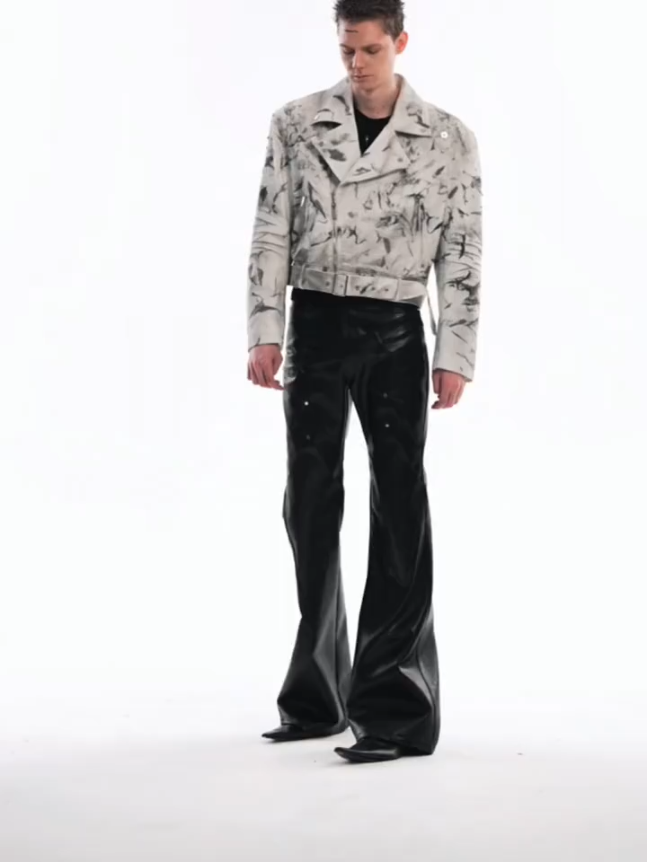 Inject raw, rebellious energy into your outerwear rotation. Crafted from premium heavyweight denim, this cropped biker jacket features an aggressive dirty-wash finish with abstract black smudges splashed across a crisp white canvas. The rugged aesthetic is expertly elevated by scattered metal rivet studs, an asymmetrical zip closure, and a structured belted hem. Delivering a highly architectural and avant-garde profile, it is the ultimate statement piece for post-apocalyptic streetwear ensembles.