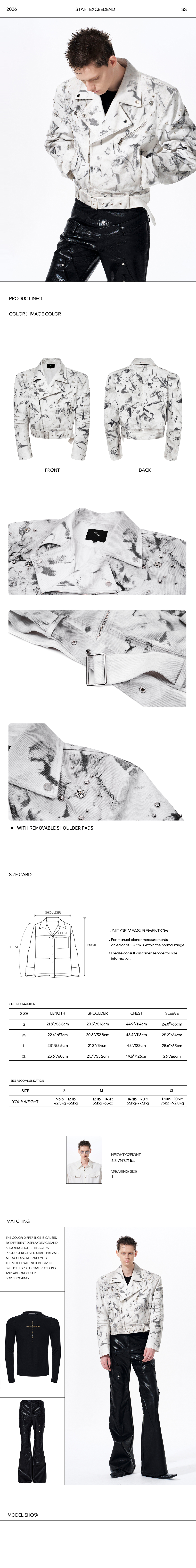 • Details: Abstract dirty wash effect, scattered metal studs, asymmetrical zip, belted hem, notch lapels