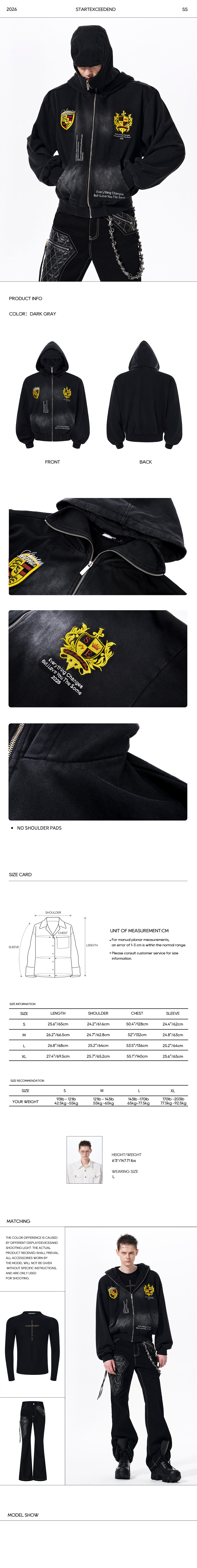 Embodying the raw energy of avant-garde streetwear, this heavyweight zip-up hoodie perfectly balances high-end comfort with dark, rebellious aesthetics. Crafted with a premium vintage distressed wash, it features striking heraldic crest embroideries and subtle text graphics across the chest. The standout detail is the high-neck balaclava-style hood, offering an anonymous, edgy look while providing ultimate warmth. Designed with a relaxed drape and a slightly cropped hem, it is a versatile statement piece for any modern darkwear wardrobe.