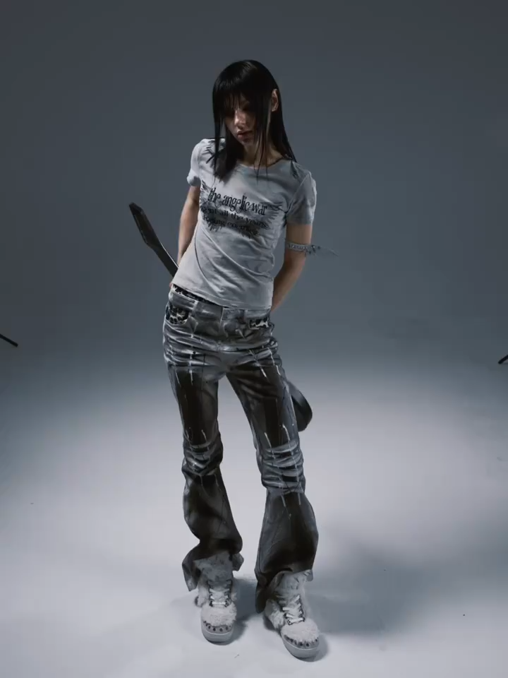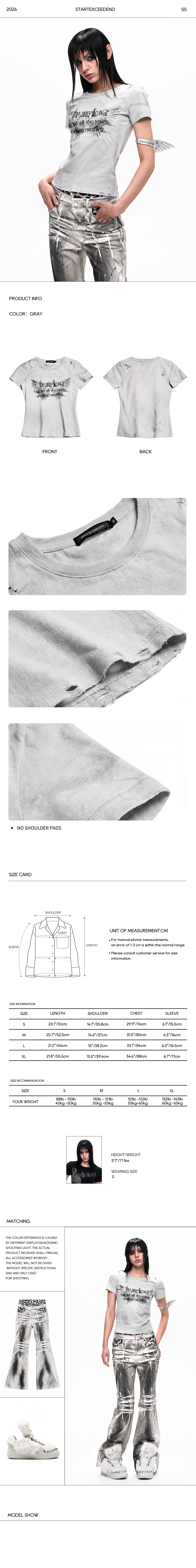 Embrace the dark romance of the urban wasteland with this subversive women's T-shirt. Cut in a flattering regular-shoulder silhouette, this piece features an aggressive dirty-spray wash and heavy distressed ripping along the neckline and hems. The chest is dominated by an intricate gothic wing graphic paired with dark typography, cementing its visual kei roots. It is the ultimate edgy staple for your alternative subculture styling.