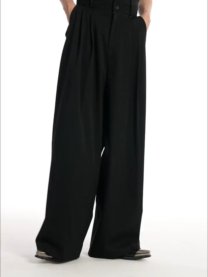 These trousers bridge the gap between streetwear and luxury suiting. Crafted from a premium, heavy-drape fabric, they feature deep front pleats that cascade into a massive, wide-leg profile. The high-waisted design is secured by a distinct double-button vertical closure, elongating the legs and providing a clean, structured waist that contrasts beautifully with the loose, flowing hem.