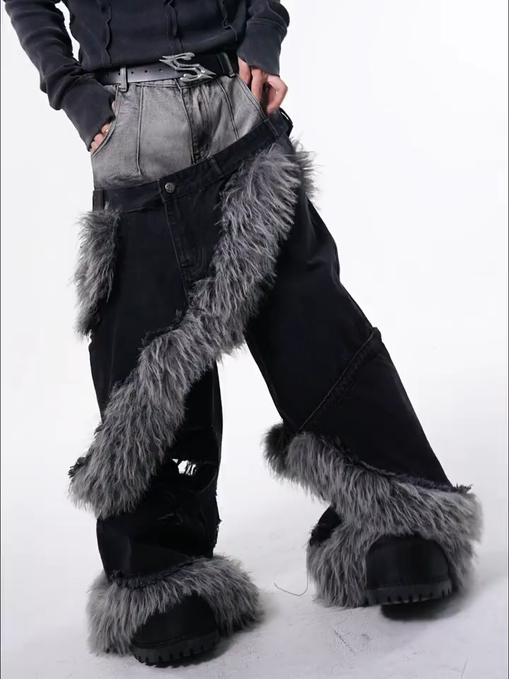 These wide-leg jeans feature a signature "double waistband" design: a faded grey top block that creates the illusion of layering, fused seamlessly into a distressed black denim body. The look is electrified by thick strips of grey faux fur that spiral diagonally across the legs and pool at the hem, adding massive texture and volume to your stride.