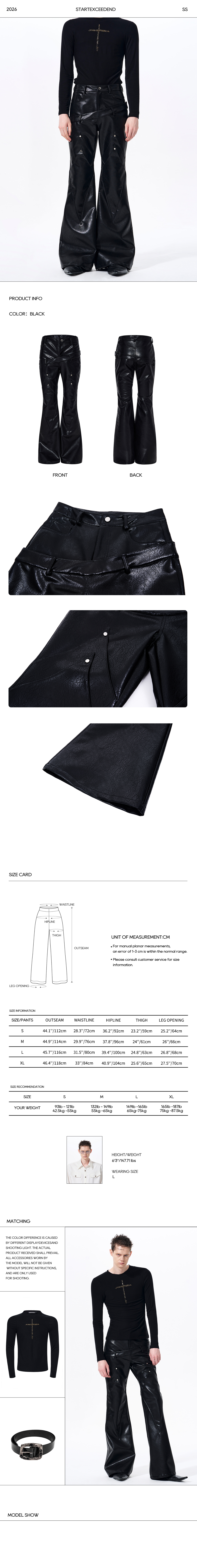 Redefining avant-garde streetwear with structural innovation. These premium faux leather pants feature a dramatic flared silhouette and a highly distinctive double-waistband design with an asymmetrical strap overlay. Elevated by precise geometric paneling and subtle metal rivet accents, they offer an architectural and rebellious look. Tailored for a fitted waist and thigh before drastically kicking out at the hem, this piece serves as the ultimate foundation for any dark aesthetic ensemble.