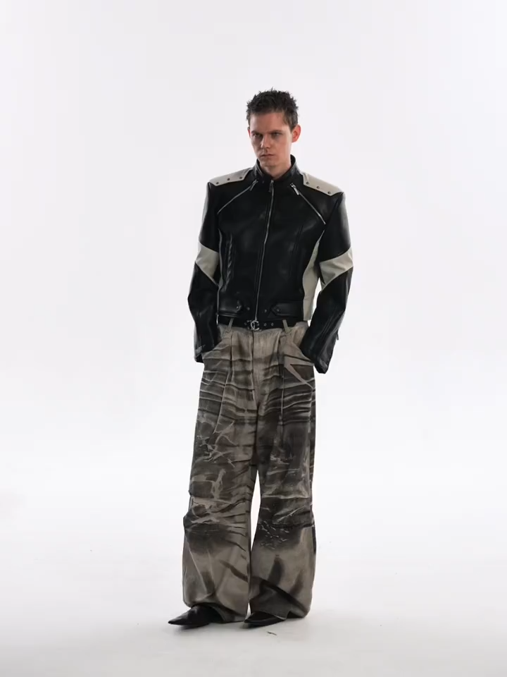 Step into the future of streetwear with this striking white moto jacket. Crafted from premium faux leather, it boasts aggressive black contrast paneling that highlights its architectural tailored fit. The back acts as a canvas for an intricate skeletal horse embroidery, bringing a dark, avant-garde twist to the pristine white base. Finished with metallic studs, statement zippers, and a buckled hem, it is a masterclass in modern, high-impact dressing.