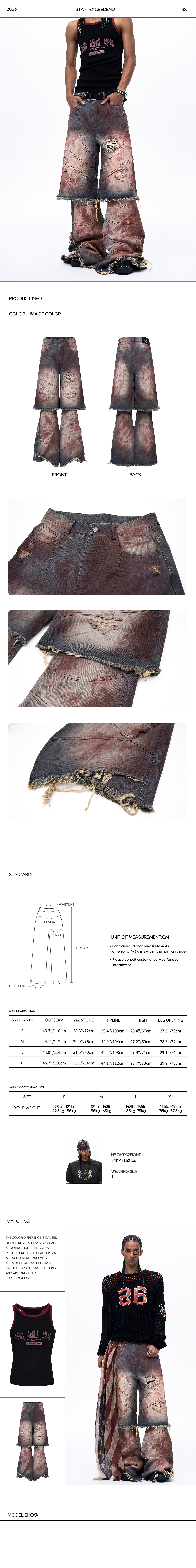 Command the urban dystopia with these avant-garde fake two-piece denim pants. Crafted from heavy-weight cotton denim, this piece features an aggressive rust and dark grey mud wash, delivering an authentic sun-baked, dirty-dyed aesthetic. The subversive design creates the seamless illusion of distressed raw-hem shorts layered over wide-leg flared jeans. Complete with diagonal seam detailing, severe ripped holes, and raw frayed hems throughout, these loose, baggy pants are the ultimate statement piece for your post-apocalyptic streetwear rotation.