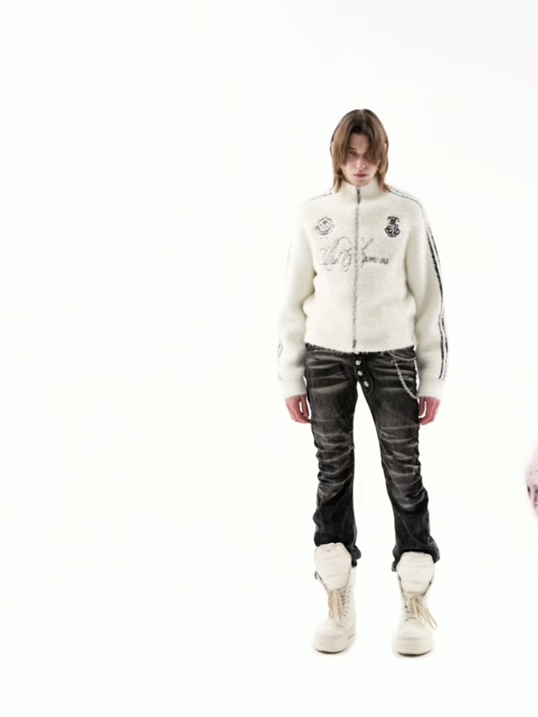 Break the monochrome cycle with a fearless injection of color. This Pink Knit Cardigan blends a soft, romantic hue with aggressive streetwear details. The plush, brushed texture is contrasted by sharp black stripe detailing along the shoulders. Adorned with gothic-style crest embroidery, this piece offers a unique juxtaposition of sweetness and edge, perfect for a standout layered look.