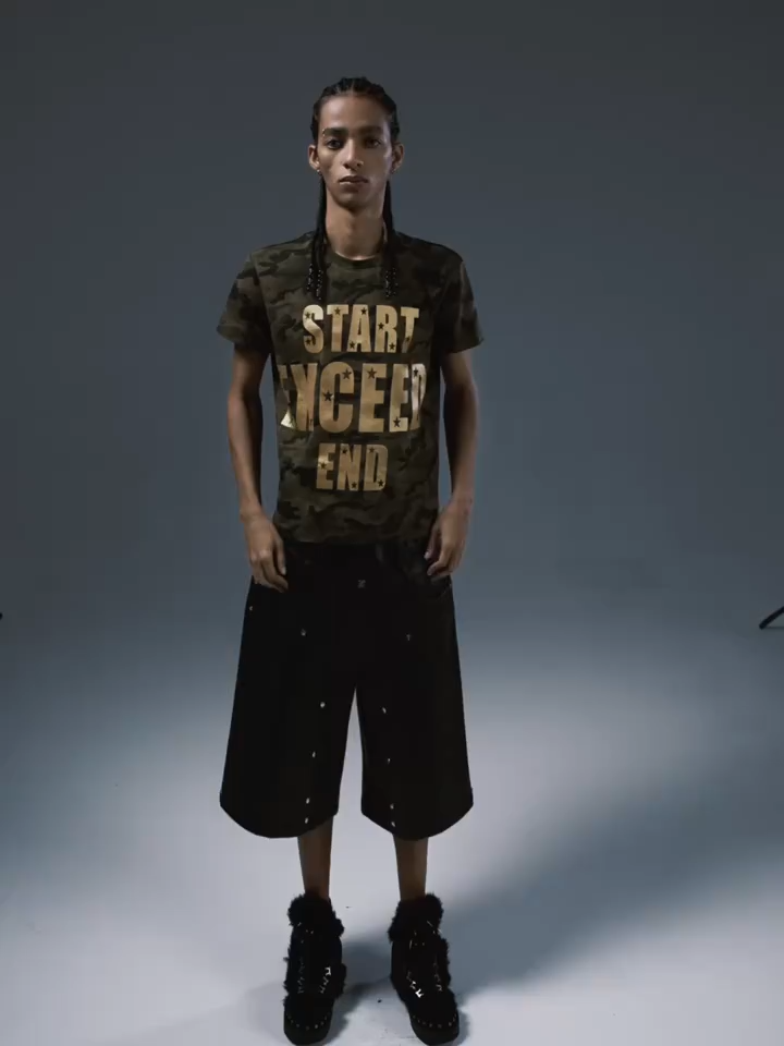 Command the streets with this striking camouflage graphic tee. Blending classic military aesthetics with bold subculture energy, this short-sleeve shirt is crafted from a soft, breathable cotton blend covered in a traditional green camo pattern. The chest makes an unapologetic statement with oversized, metallic gold-foil typography reading "START EXCEED END," which is subtly detailed with miniature black stars inside the lettering. Cut in a standard, slightly tailored fit, it is the perfect standout piece to pair with dark denim, cargo pants, or leather trousers for an edgy, tactical Y2K look.