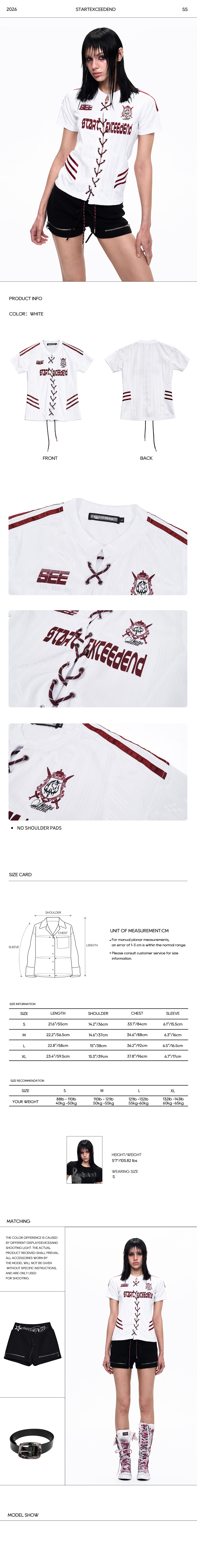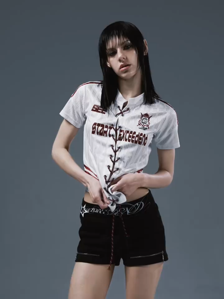 Elevate your alternative wardrobe with this subversive sports-inspired baby tee. Crafted from a textured ribbed fabric in crisp white, it features an edgy lace-up corset-style front for a customizable, waist-snatching fit. The chest is detailed with an original heraldic crest and bold burgundy "START EXCEED END" typography. Finished with athletic stripe accents on the sides and sleeves, it perfectly blends Y2K sporty aesthetics with dark feminine energy.