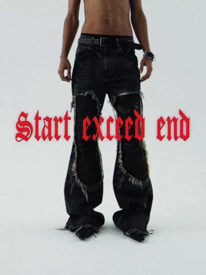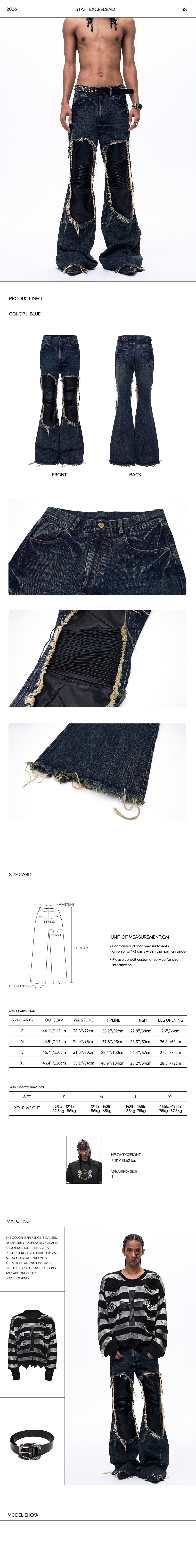 Command the streets with these avant-garde flared jeans. Crafted from heavy-weight denim in a faded vintage wash, these pants feature aggressive ripped distressing and raw edge hems for an authentic, post-apocalyptic worn-in look. The focal point is the striking black faux-leather patchwork panels at the knees, adding a luxurious yet rebellious contrast to the rugged denim. Cut with a tailored flare, they are engineered to drape flawlessly over your favorite chunky boots or sneakers.
