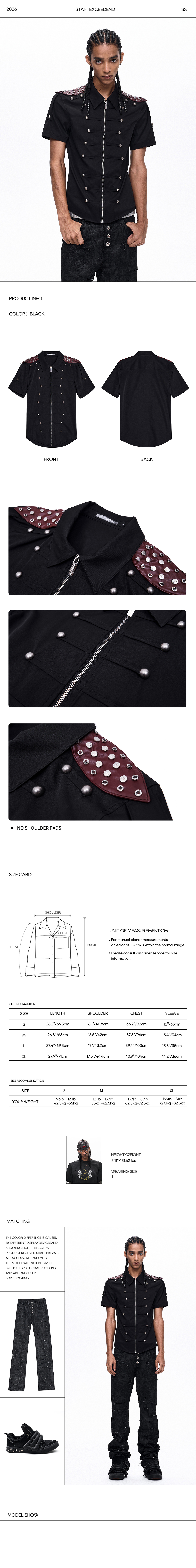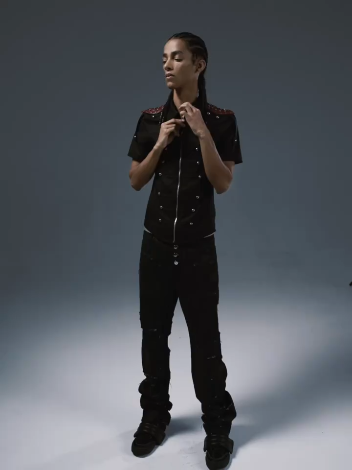 Command the streets with this striking short-sleeve zip-up shirt. Blending medieval military aesthetics with punk rock rebellion, this fitted black top features a sleek full-zip front flanked by distinctive horizontal piping and metal ball buttons, drawing inspiration from historic hussar tunics. The standout detail is the dramatic burgundy faux-leather shoulder epaulets, heavily embellished with silver studs to create an aggressive, armored look. Perfect for elevating your dark alternative wardrobe, it stands as a bold statement piece.