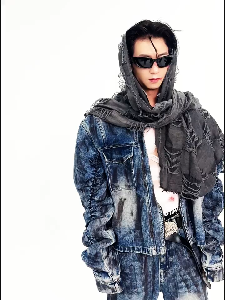 This two-piece set is crafted from premium blue denim treated with a heavy "mud wash" and oil-stain finish, creating a unique, dirty-vintage aesthetic. The jacket features a cropped, boxy cut with a stand collar and aggressively ruched "stacked" sleeves for volume. Paired with matching panelled jeans that flare at the hem, this look delivers a sharp, elongated silhouette with an undeniable grunge edge.