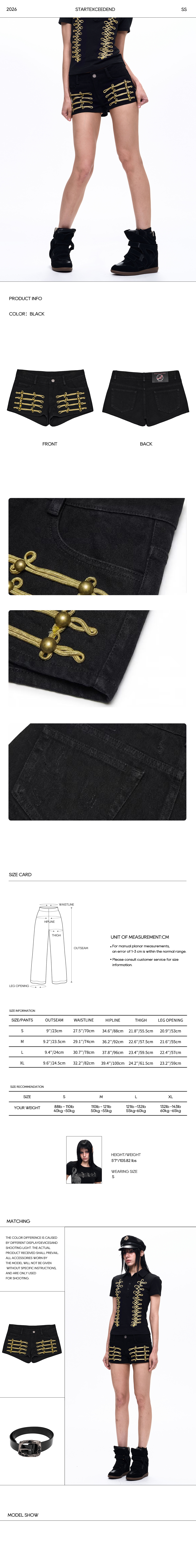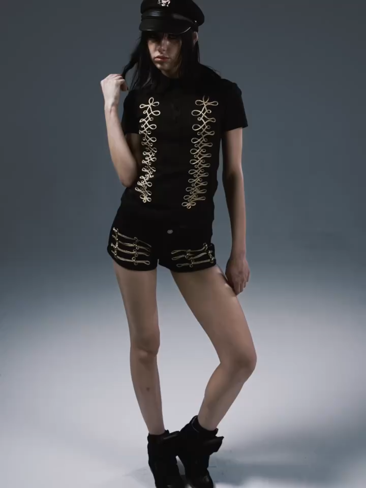 Command the urban battlefield with these striking vintage-inspired shorts. Merging aristocratic military aesthetics with subversive streetwear, these black denim hot pants feature intricate gold braided soutache embroidery (frogging) across the front, reminiscent of historic Napoleonic uniforms. Cut for a daring, figure-hugging micro-short silhouette, they perfectly balance dark romance with commanding authority. Finished with classic back pockets and an exclusive brand patch, they are the ultimate statement piece for alternative styling.