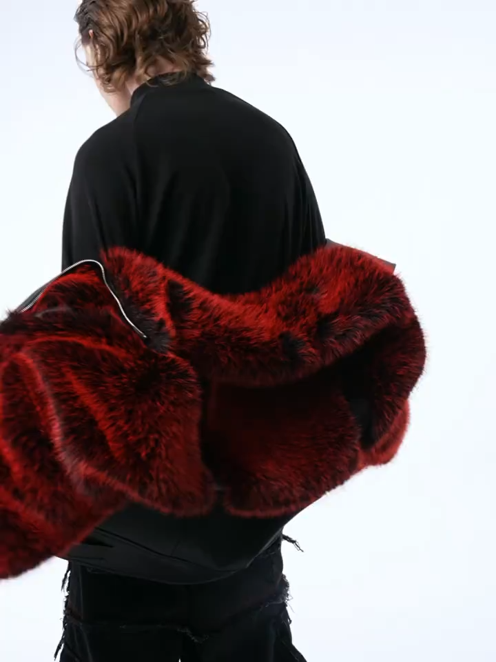 Stripping away color to focus entirely on silhouette and touch, this jacket features the signature chevron architecture in a tonal mix of jet-black long-hair fur and smooth leather. The interplay of light-absorbing textures creates a deep, luxurious visual depth. With its imposing high collar and wide structured shoulders, it provides a powerful, gothic-industrial profile.