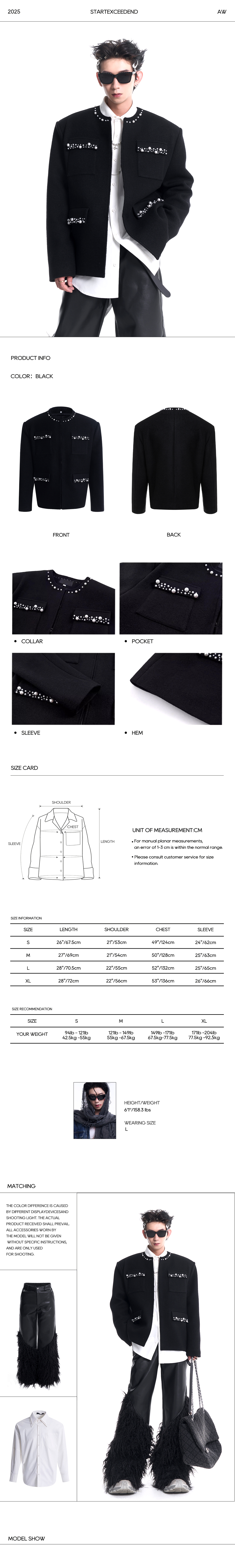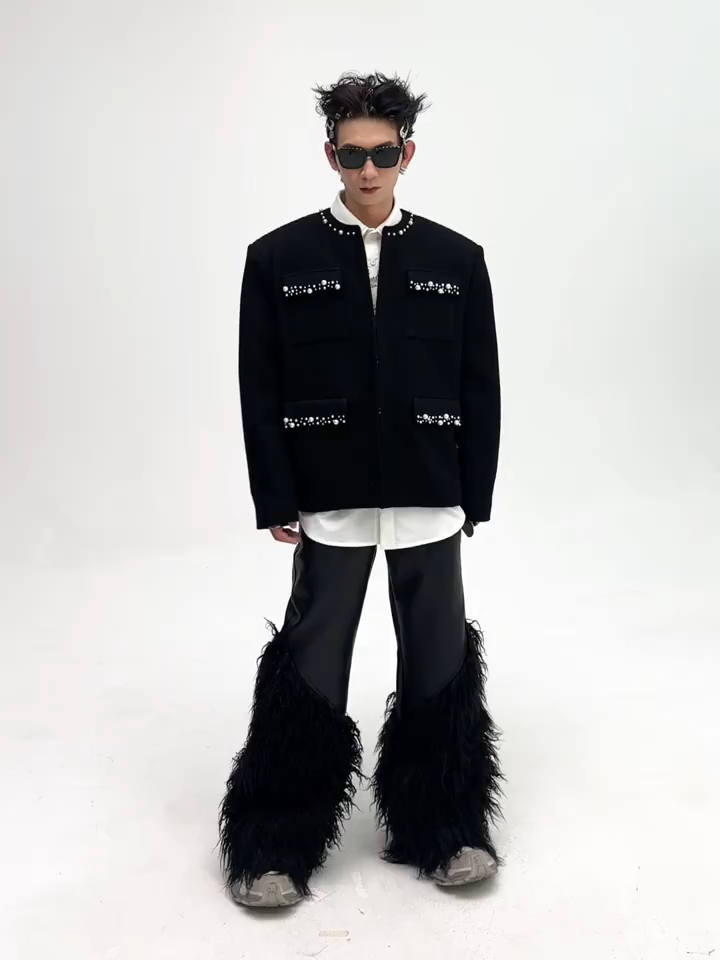 This structured, collarless blazer is crafted from a premium heavy wool blend in deep matte black. It is redefined by hand-applied pearl and silver bead trim along the neckline and four front patch pockets, creating a look that balances vintage luxury with modern street edge.