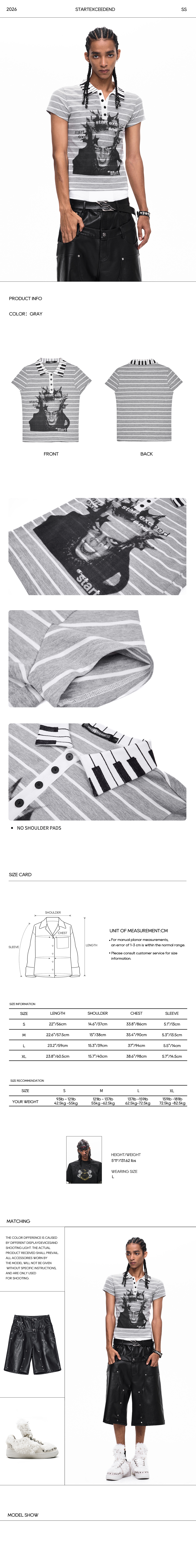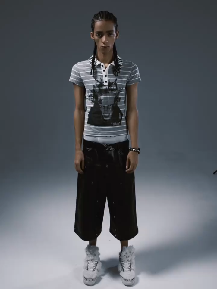 Hit the right notes with this subversive short-sleeve polo shirt. Merging punk-rock energy with Y2K streetwear, this fitted top features a classic grey and white horizontal stripe pattern. The standout detail is a unique contrast collar printed with a bold black-and-white piano keyboard motif. The front canvas is dominated by an aggressive, oversized punk portrait graphic, subtly overlaid with "start exceed end" typography. Cut for a flattering, body-skimming fit, it’s the ultimate statement piece for your alternative darkwear or casual grunge rotation.