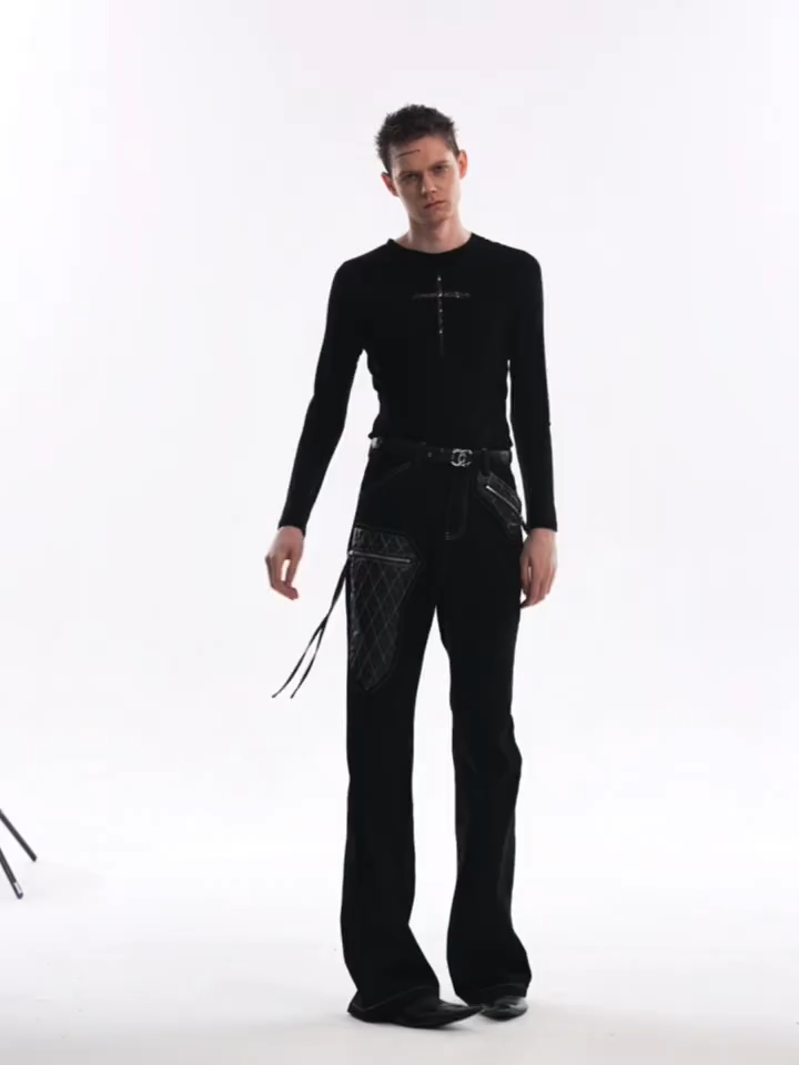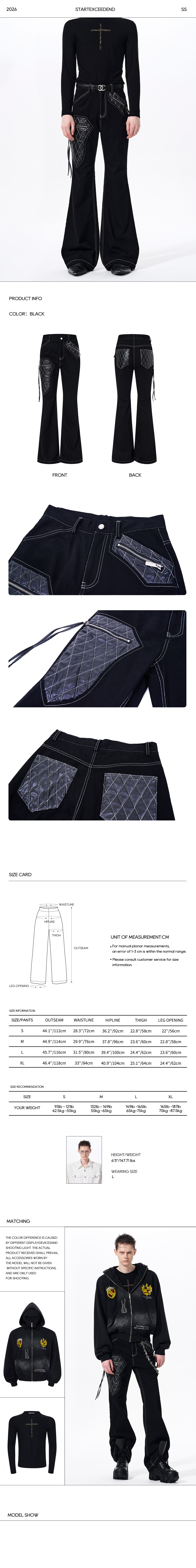 Redefining dark streetwear by blending tactical utility with architectural tailoring. These flared denim pants are constructed from a premium black canvas, aggressively highlighted by striking white contrast stitching. The design is elevated by avant-garde quilted faux leather patch pockets, complete with heavy zipper hardware and leather fringe detailing. Offering a fitted waist that dramatically flares at the hem, this piece is engineered to be the ultimate anchor for any high-end rebellious look.