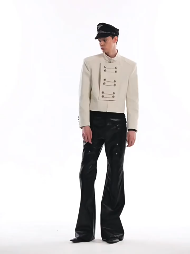 Redefine vintage tailoring with this Ivory White corduroy jacket. Merging traditional Chinese stand-collar elements with modern avant-garde proportions, this cropped piece creates a striking visual impact. The crisp ivory corduroy provides a luxurious, tactile finish, beautifully contrasted by the bold metallic hardware across the chest. It is an architectural outerwear piece designed to elevate any premium, dark-toned or monochromatic streetwear ensemble.