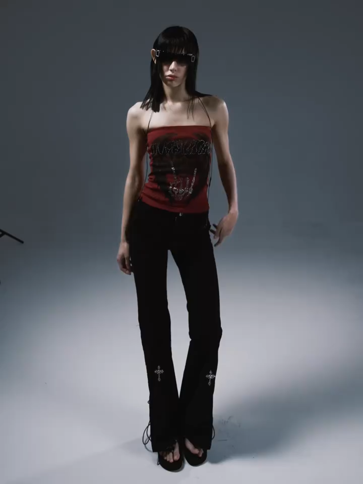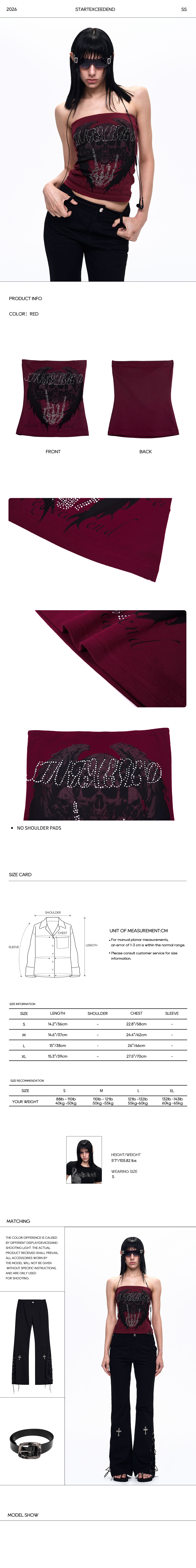 Make a bold, subversive statement with this edgy strapless tube top. Crafted from a deep burgundy stretch fabric, it offers a flawless, body-contouring fit. The dramatic centerpiece is an original gothic skull and wings graphic, heavily embellished with shimmering rhinestones that spell out striking typography and outline a skeletal hand motif. Perfect for layering under a leather jacket or wearing solo, this piece seamlessly blends dark feminine energy with Y2K mall goth aesthetics.