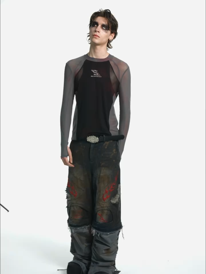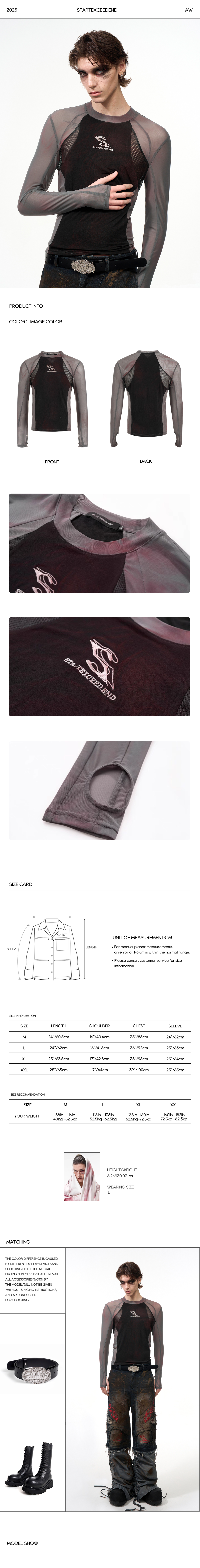 This avant-garde top features a panelled construction, merging a washed black bodice with semi-sheer grey mesh raglan sleeves. The fabric offers high-stretch performance for a second-skin fit, while the functional thumbholes and raw-edge detailing add a subversive, industrial finish. Perfect for layering or wearing as a standalone statement piece.