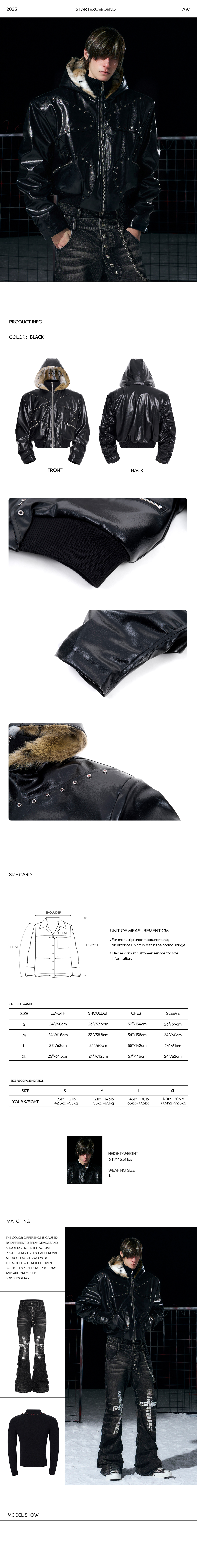 This cropped, boxy bomber is crafted from premium high-gloss PU leather in deep black. It features intricate silver rivet detailing in a western-gothic arrangement across the chest and back, paired with signature heavy ruched sleeves that create a stacked, dimensional look. The oversized hood is lined with luxe animal-print faux fur, offering high-end comfort and warmth to match its aggressive exterior.