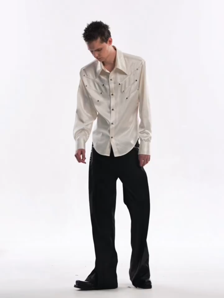 Embodying the intersection of avant-garde streetwear and modern tailoring. This long-sleeve shirt features a premium wrinkle-resistant textured fabric with a subtle, luxurious sheen. Accented with distinctive western-inspired chest paneling and custom metallic hardware, it delivers a sharp, structured look with zero maintenance. Perfect as a striking standalone piece or a bold layering option beneath a dark jacket.