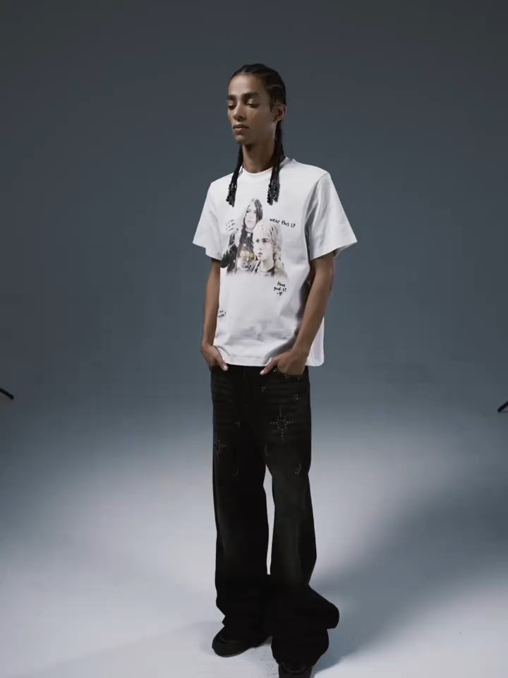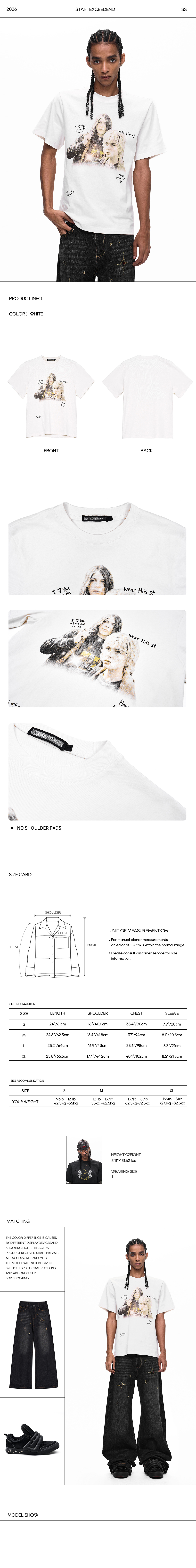 Elevate your street-ready wardrobe with this vintage-inspired portrait graphic tee. Crafted from premium breathable cotton, this crisp white short-sleeve shirt features a striking retro photographic print of an indie duo. The artwork is surrounded by edgy, hand-drawn graffiti-style typography (featuring phrases like "I ♡ You til we die" and "call me maybe?"), giving it an authentic DIY underground vibe. Designed with a comfortable, relaxed fit, it effortlessly captures the essence of Y2K nostalgia and hip-hop street culture. Perfect for pairing with baggy denim or cargo pants for a standout urban look.