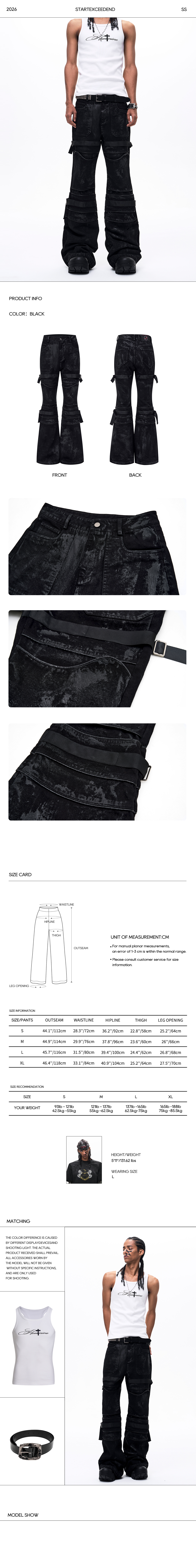 These avant-garde, slightly flared jeans redefine dark streetwear with an intricate network of structural strapping and buckles that acts as a harness for the legs. Crafted from heavy-weight denim with a deep dark wash and a brushed wax finish, they offer a semi-gloss, leather-like texture. Adjustable straps allow for fit customization around the knee and ankle, while raw, deconstructed hems cement the post-apocalyptic aesthetic.