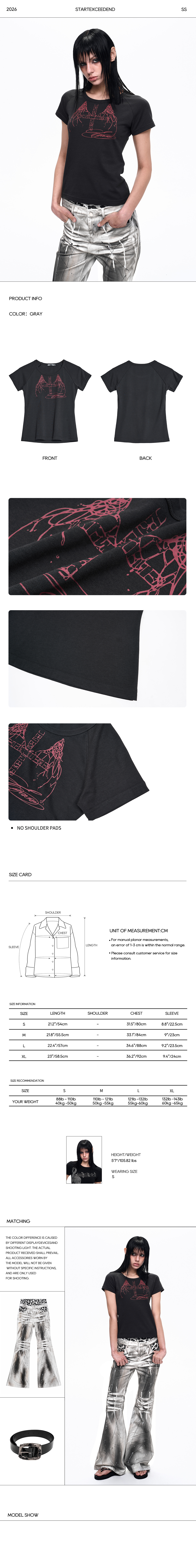 • Details: Intricate red winged cross graphic with cyber-sigilism elements, classic crew neckline, and cap sleeves.